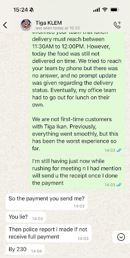 We’ve been repeat customers of Tiga Ikan and previously had good experiences, but our recent order was very disappointing. We ordered corporate lunch delivery (not dine-in) for Monday (28/4) via phone. Despite requesting the invoice promptly last Friday (25/4) to proceed with payment, it was never sent. Follow-ups were ignored, and communication was poor — including blue-ticked messages and delayed replies.