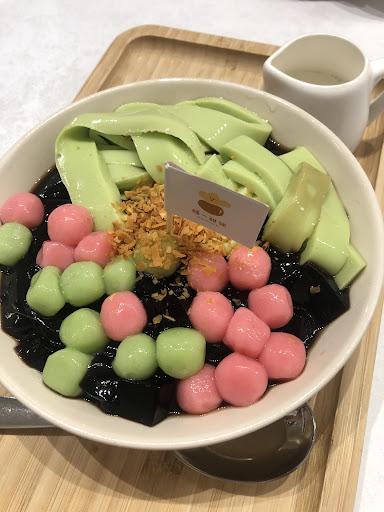 Pandan jelly noodles with grass jelly and mini glutinous rice balls. The noodles is true to its claim with pandan flavour. Hold its shape nicely. The grass jelly is tasteless. All three main ingredients are 0% sweetness. The sweetness is from the syrup and the coconut milk. It would be good if they add some sweetness to create a more harmonious taste with the milk and syrup. The baked coconut flesh is good addition for texture.