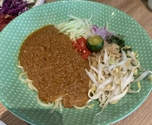 Laksa Johor Ms. Zee - Rich, thick gravy generously laden with fish on top of spaghetti and garnished with raw vegetables. Tasty and savoury. A well-made true classic.