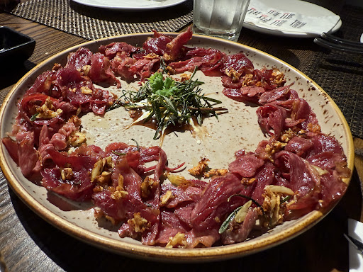 The steak was another let-down — served less than warm, with no crispness on the outer layer. It lacked any decent sear, and cutting into it felt like slicing through wobbly rubber. Soft, untextured, and just disappointing. The appetiser, described as sliced beef, turned out to be preserved dried beef — quite different from what we were expecting.