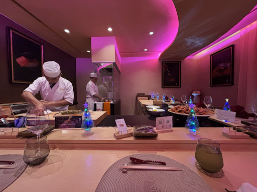 Read moreFirst impressions at this 2-year old Omakase Sushi joint might give some pause, however food and service are excellent. From the outside of its ground floor location of an office building, with its gauze curtains and colored lights, the decor isn’t typical of sushi bars. However, once seated at the 12-pax bar, food and presentation are what you would expect of a high-end Japanese joint.