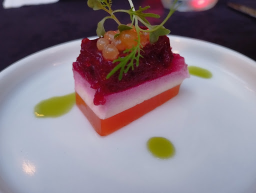The warm welcome of the focaccia and grissini, accompanied by a smooth extra virgin olive oil, quickly soothed my palate. And then came the amuse-bouche – a playful three-layer symphony of capsicum jelly, pecorino panna cotta, and beetroot jelly crowned with vegetable caviar. The creamy pecorino stole the spotlight, leaving me eager for more.
