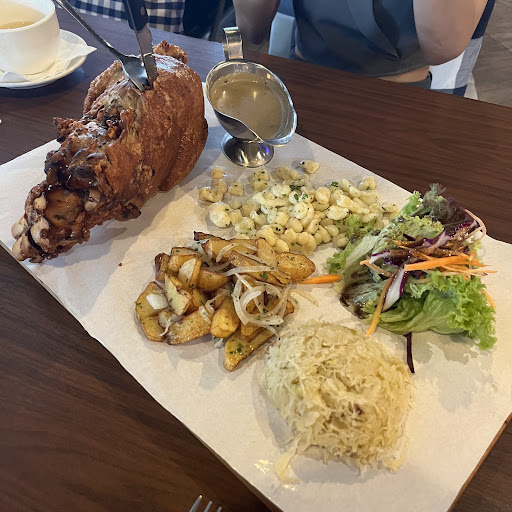 One cannot visit this establishment without trying 'The Pork Knuckle,' and it certainly lives up to its reputation. This behemoth of a roasted pork knuckle arrives with an array of side dishes, including fermented cabbage and fried potatoes. The sheer size of it prompted the waiter to offer assistance in cutting it into more manageable bites.