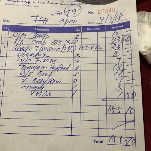 When we first arrived, the owner was honest enough to tell us that they do not have live seafood (we wanted to order live mud crab) & he told us they use frozen seafood (we're okay with that but were a little disappointed since it was a seafood restaurant). We ordered clam soup, tiger prawns steamed with garlic (RM $86.30 for 2 pieces), scallops with fu gui sauce (oyster sauce) & mushrooms & vermicelli, prawn omelette and clams stir fried with onions and a can of fanta grape. Total bill came up to RM $159.80.