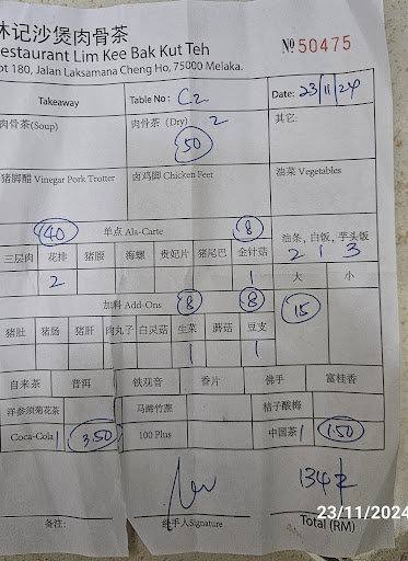 Read moreit's ..... look the bill. Ordered 2 person dry & 2 person soup BKT add inoki mushroom& sayur + only ribs meat ... NO pork inlets / parts + 3 yam rice & 1 white rite + 1 can coke + 1 Glass China tea & 2 bowls you char keuh... total RM134.00 ... go think for yourself expensive or cheap.or value for money. .. hahahahaa. We are malaccans but your price .... no wonder only 2 table on Saturday at 11am,