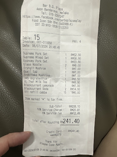 On 9th June 2025, we visited Bar.B.Q Plaza at Aeon Bandaraya Melaka and tried their set lunch options. We ordered the chicken set lunch and pork set lunch, both priced at RM19.90 each.