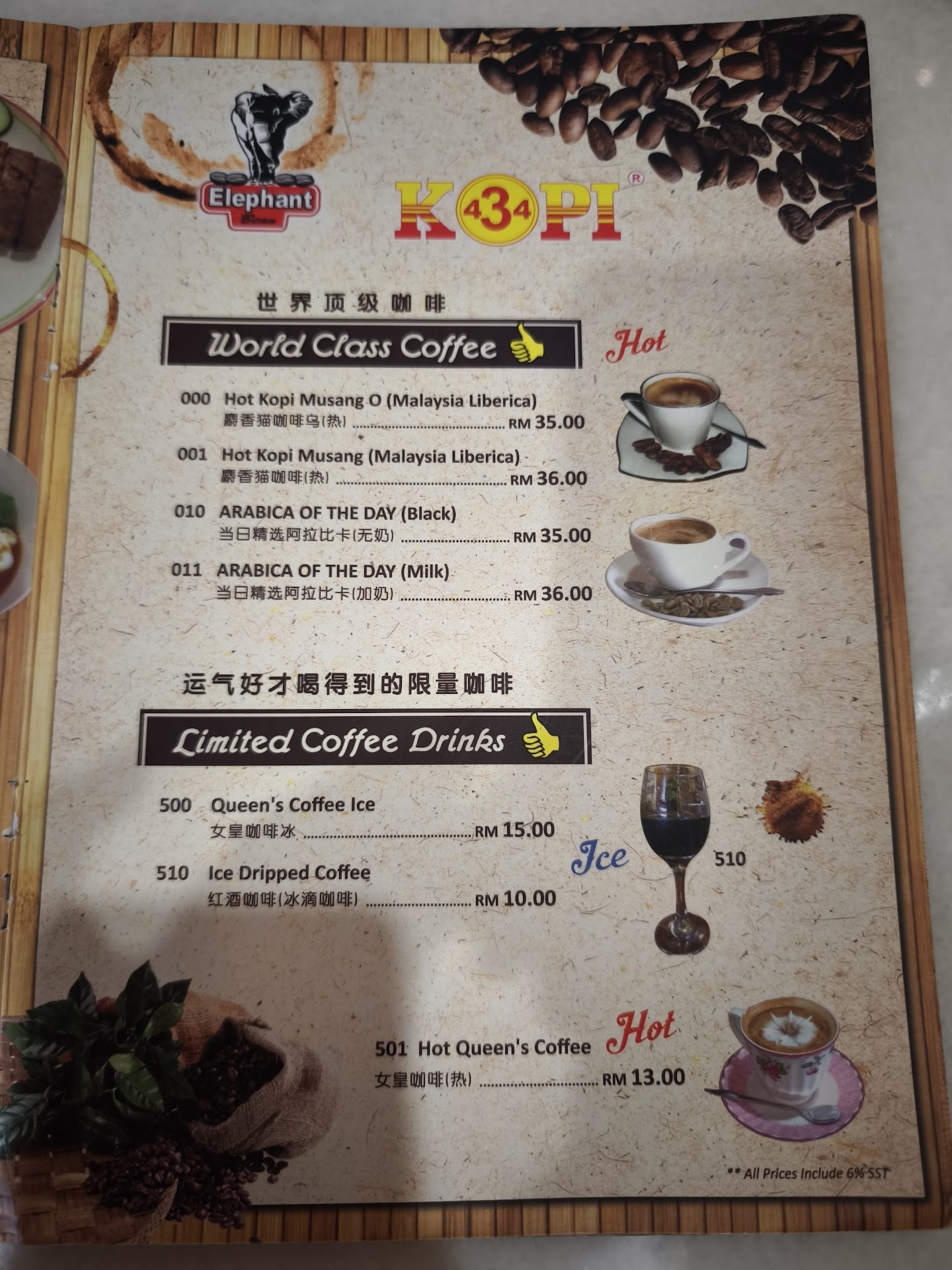 100% elephant bean kopi o iced, without milk, is highly recommended as compare to the 1960s iced coffee with milk. One could taste the smoky aroma of the coffee. I know that the beans was perfectly roasted with sugar, salt and margarine.