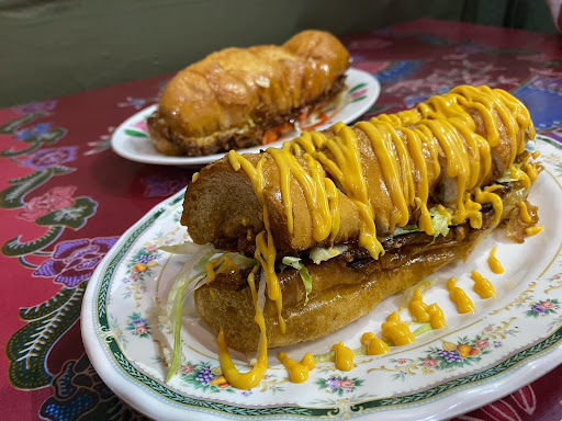 Yummy. "Roti John". The name of special sandwich in Malaysia. Serve with feet long crunchy bread (some divide by 2). The filling is combination of meat/chicken with variety of sauce(chili/ketchup/mustard/thousand island etc. depend to chef).