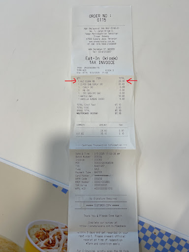 We purchased our meal and one of their promotional soft toys for RM 29.90 on 5th February 2025 through their kiosk as we were told they didn't take cash when we wanted to pay with cash.