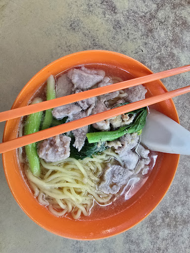 This shop is actually a few street stalls under one roof, like a kopitiam. I ordered the pork noodles clear soup style. Basically the soup is slightly flavoured with pork, seasoned with pepper. The soup tasted alkaliney from the noodles, imparting a yellow hue to the soup. The yellow noodles were not too starchy, but otherwise not noteworthy. The pork was seasoned well and the dipping sauce had a decent punch of heat. Overall, this reminded me of school canteen soup noodles 20 years ago. The elements were okay, but the strong alkaline taste in the soup was not what I would enjoy. The soup was also not flavourful enough, for a soup...