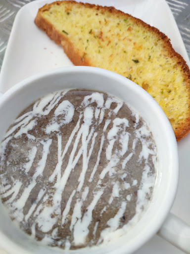 Ordered a glass of hot water, forest mushroom soup and grilled sirloin steak - was cooked adequately to my request of "medium well" n potato wedges were nicely crisped. However the broccoli, cauliflower n carrots that came with it were undercooked ( I had to chomp down on them n they were not crisp like half-raw veggies would be, which tells me they're not fresh) but had burnt black bits all over (the cook should have cooked them in a clean pan!) and everything was overly salty. The steak had some spice seasoning AND salt, n the sauce that came with it was also salty I had to send the soup back as it was really too salty to swallow, tho the base was tasty enough n there were lots of chopped mushrooms, that is, cooked from scratch not from a can.
