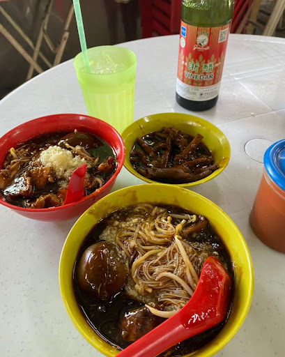 Read moreLove the Loh Mee here, the vinegar and garlic is what upgraded the flavour of their soup/sauce. There is no obvious overuse of the 5 spice powder (thankfully), it is melted pork fat, collagen, skillfully balanced out with five spice powder, and brought to the next level with their in house sambal, black vinegar and pureed garlic. Price remains competitive with RM 6/ standard bowl with all cuts of pork. You can choose to have with either all bihun or mix bihun-mee or pure yellow mee. Portion is enough for a person but could always have another bowl since I'm greedy. Less one 🌟 only because the pureed garlic now is more watery and no longer have sambal on the table for us to add ourselves incase we want more, so extra hassle to ask the lady/boss for more sambal. Chicken feet is also good, because they used the same sauce for their loh mee, definitely a rival to Kimberly Street in Penang. They only open till 2pm, and the popular pork cuts(skin,ears, off cuts) are sold out by 1.00pm, so better go early if you want all the good stuff. However doesn't mean the ones left are bad, it's just the pork leg and loin;more lean meat?it's still soft and falls apart since these meat were stewed for so long. Open air sitting under Zinc roof, hence recommended to go during breakfast. To cool off the heat during lunch, have some iced red...