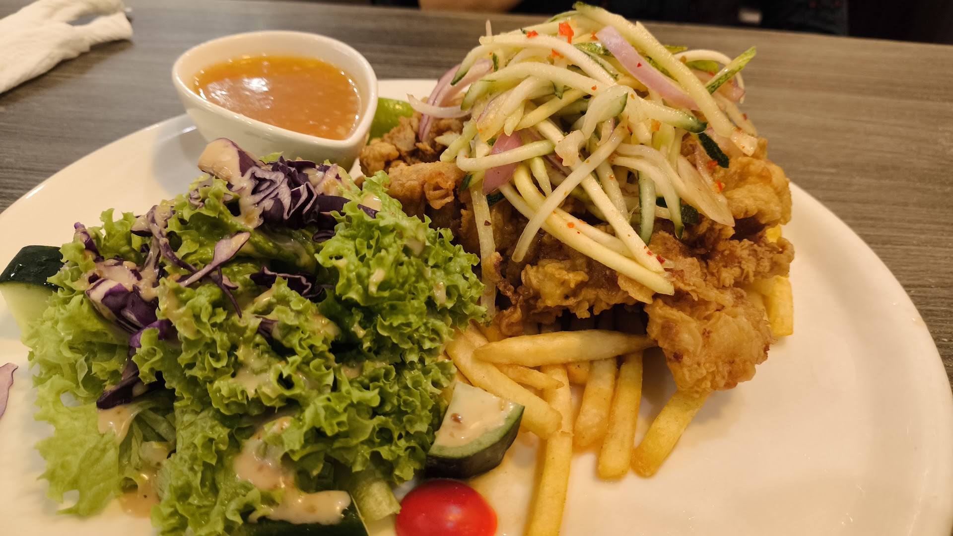 Chicken chop, omg. Kerabu spot on, not too spicy, not too sour. Thai sauce very balanced, very flavourful, feels like home made, not cheap taste like the ones I eat at hawker stalls or James Foo. The chicken omg hands down the best I have (imagine me praising the fried chicken lmao), its batter is very light, not overcooked, not burnt, flavour gives a light hint of spice (almost like KFC flavour). The chicken fuiyoh very juicy and not dry. The size and portion is seriously big, and it definitely is not because of the flour and batter.