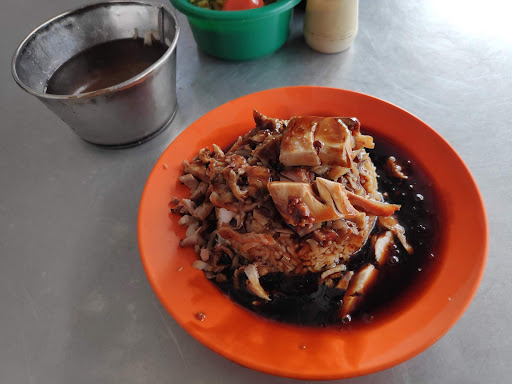 They will then shred up what looks like 1 Roasted Chicken Drummy and pile all the Shredded Chicken Pieces on top of the White Rice. The Dish is then finished off by Lumming the Whole Thing with a Thick Generous Layer of Lor Zhup.