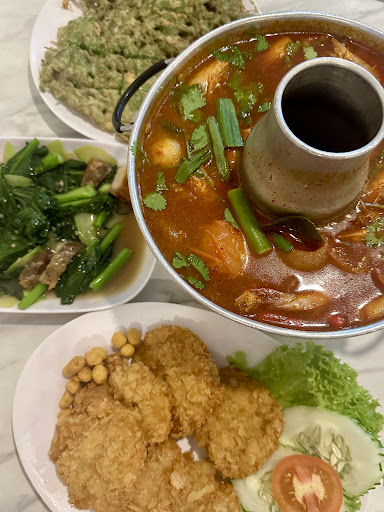First of all, the place seems to be very packed and actually it is full house when we arrived near 7pm that time. Booking is not allowed so you have to queue and luckily we don't have to wait long. Ordered a few dishes and they are all very good. We ordered fried pork knuckle, seafood tom yum soup, fried prawn cake, fried sotong, sambal bamboo shoot, fried omelette, otak otak and tub tim krob for dessert. Oh and also the Thai milk tea.