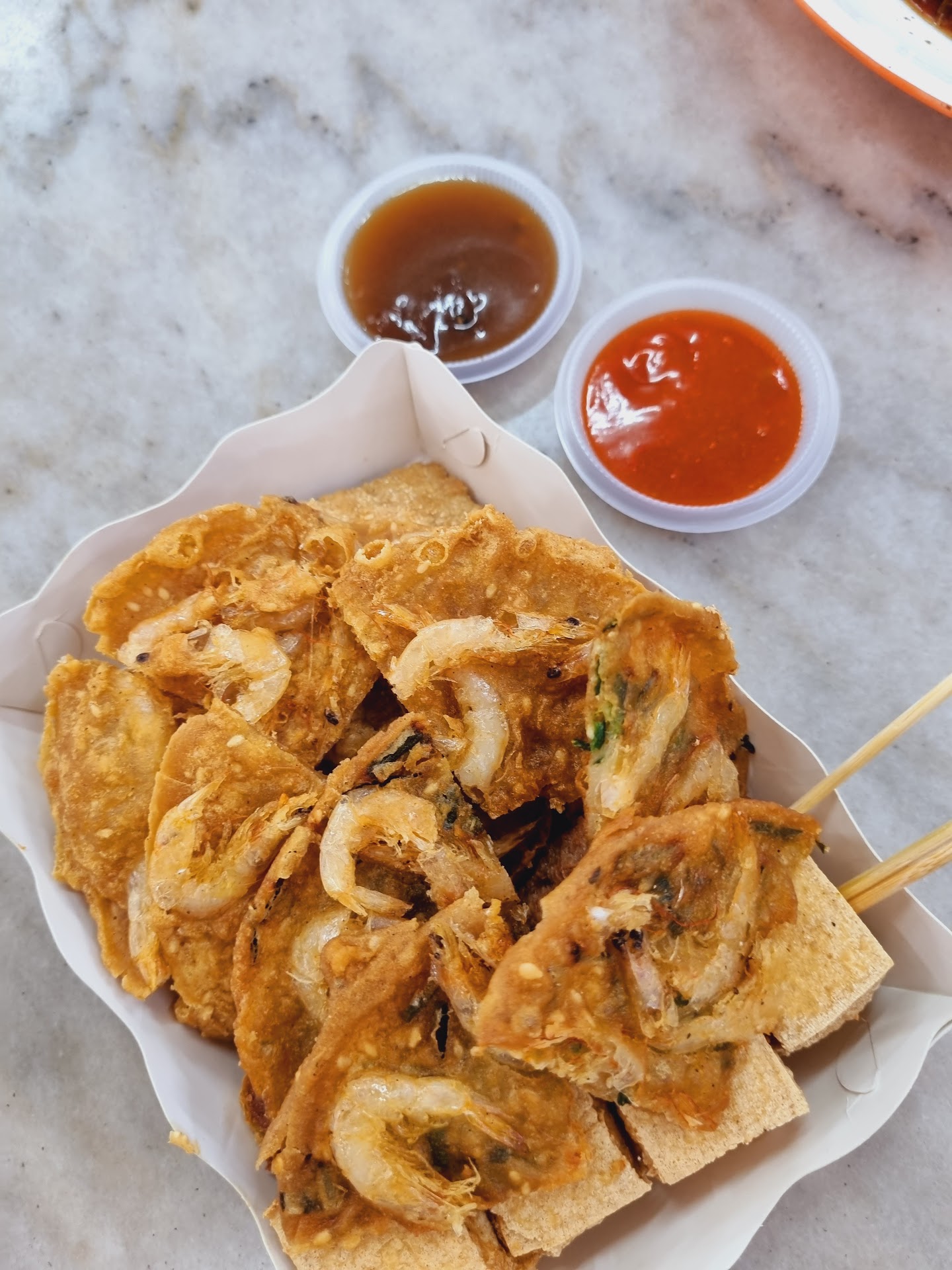 Yearning for some deep-fried lobak? Somewhere in the middle there's a stall serving an array of this - must-try the prawn fritters. Two versions - with chives and without. Both are yummy!