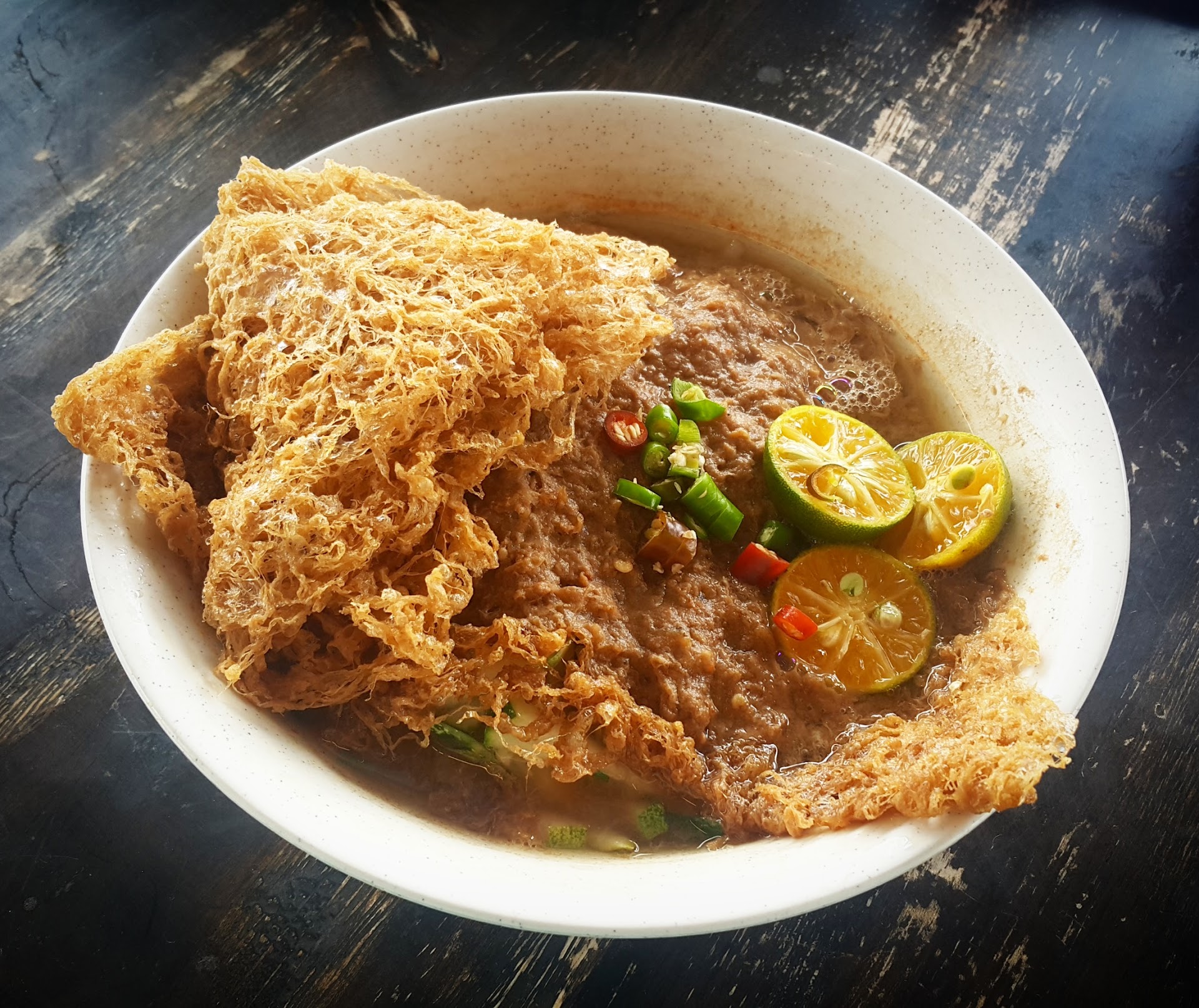 The telur bersarang or literal translation, nest-y egg, is actually egg that is fully fried using a special technique that will make the fried egg looks like a bird nest. It is then added on top of the laksa. So instead of the usual boiled egg that goes with the laksa, it has this specialty nest-y egg.