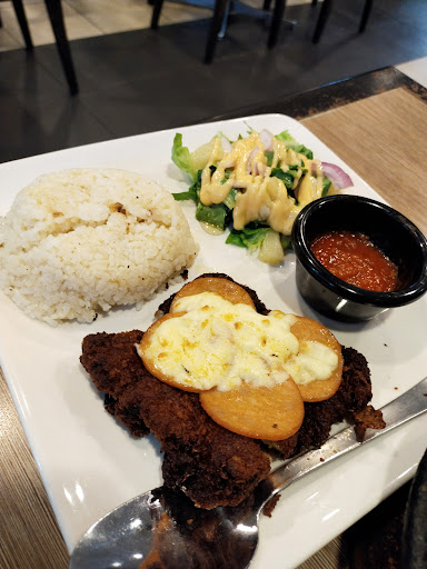 Read morewe ordered the promotion set. we got the chicken parmigiana, garlic bread, Wildberry n passion tea, 1 personal pizza n mushroom soups. chicken parmigiana is the big reason why i deduct 2 star here. the chicken as u can see was black n dark color. i hate to say that its the worse chicken parmigiana i ever taste. there is no other diners inside but yet we got 1 bad overcooked chicken. so bad. i hope that they can do better. the only good job that i can say is the garlic bread n pizza. love it. the place are okay, cool vibes. located near the main door...