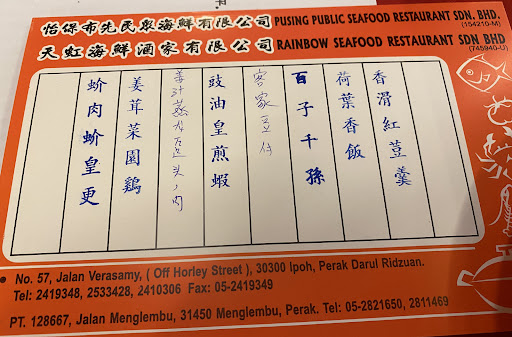 Rainbow and East Ocean are the two best restaurants in Menglembu area. Food served by Rainbow Restaurant was quite good. Dishes served tonight may not all taste the best, but there were no complaints either. You get your money’s worth. Had another dinner here on 30th April 2023. This dinner was held in honour of cousin sisters came back all the way from USA. Again everyone was very pleased with the food. 14/4/2024 Sunday Visited this restaurant again for Association Dinner. All dishes were highly satisfactory, not a single complaint from fellow diners. This is a branch of Pusing Mun Chong Ipoh and it seems to have achieved the equivalent standard set by its parent restaurant. One thing though, preordered dishes seem to taste much better than just walk in and ordered dishes. This is generally true for all restaurants. Maybe by preordering, they had more time for the preparation of ingredients and assign their best cook...