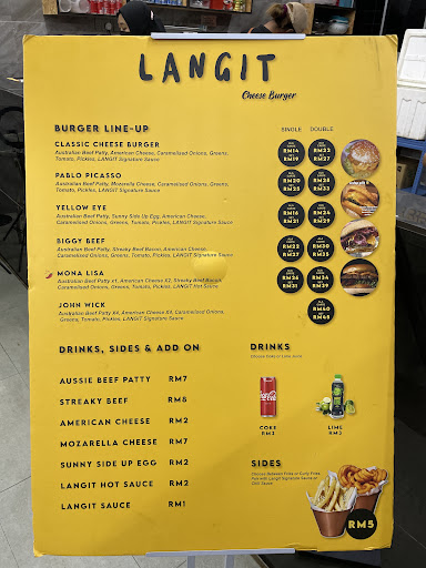 Mula mula dah beratur panjang sebab nampak stall burger, tapi takperasan menu. Dah sampai depan baru nampak menu dengan harga. Bukan terkejut tengok menu, terkejut tengok harga. Sebab jurang harga lebih mahal dari Mcd. Walaupun tagline “Langit cucuk Mekdi”. Harga burger sekali dengan fries nak dekat rm30. Padahal Mcd kalau dua puluh lebih sah sah dapat large fries dengan air besar. Bila letak harga macam ni, dengan takda pilihan air, expectation jadi tinggi. Sebab bayar mahal, dalam food stall ni korang punya booth paling mahal rasanya. Dah pusing dua round dah. Your range of price for your burgers, are similar to Fuelshack in KL, taktahu fuelshack brand apa silakan google. Burger sedap, fries banyak dan surprisingly ada air. Memang diorang charge set diorang rm20-30, tapi location Fuelshack kat dalam KLCC bro, logic lah letak harga macam tu. Ini korang buka stall saja, cekik sampai rm50 untuk dua burger. Fuelshack punya patty range around 80gm-150gm, bayar mahal tapi puas hati.