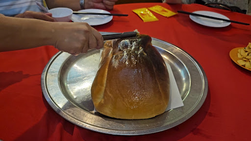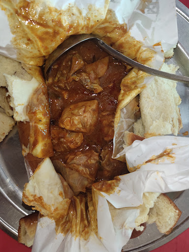 After the server cuts opens the top the piece of tracing paper, you can either dish out a portion of the curry chicken into a bowl to dip you piece of bread init.
