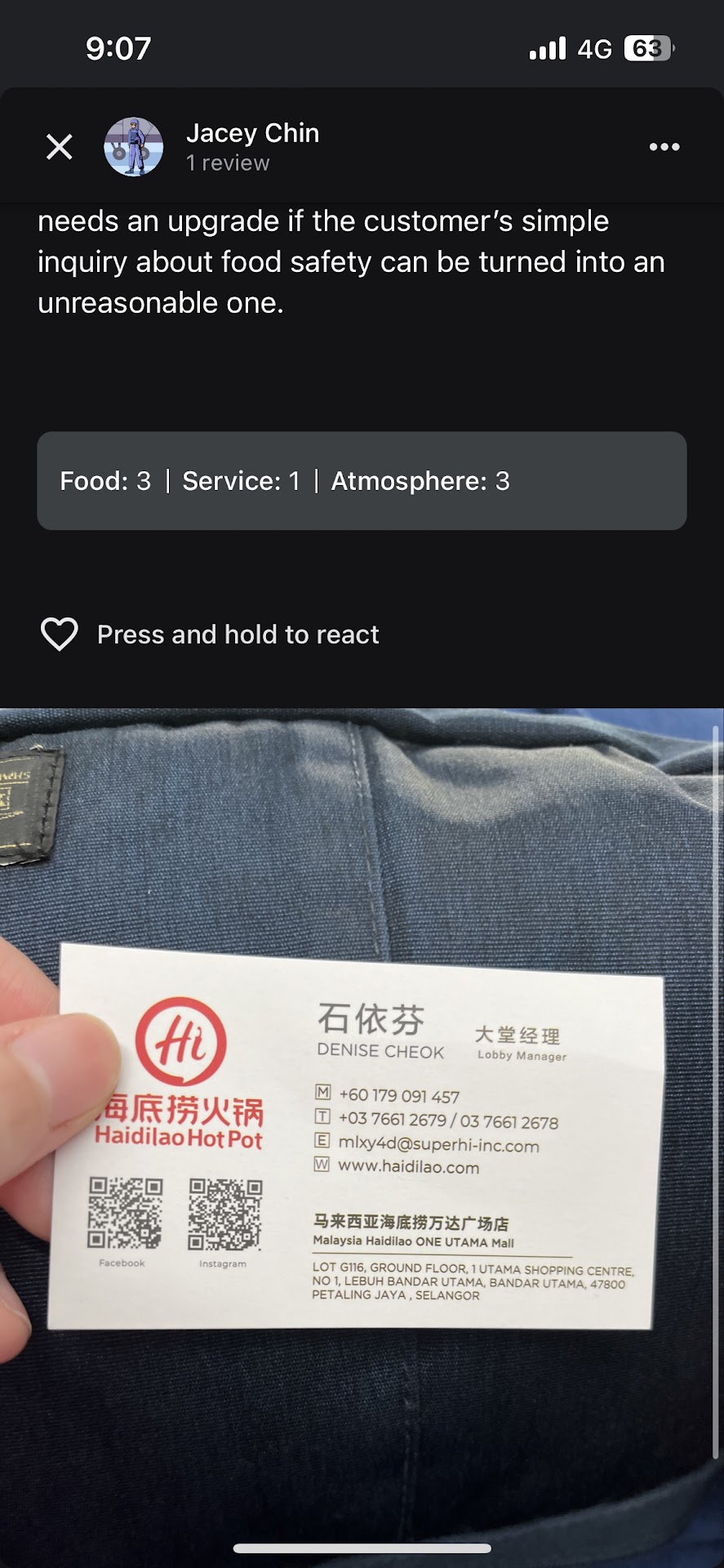 I haven’t been back to Malaysia for a while and this is the first Haidilao experience where we were greeted with such blatant rudeness and hostility. Staff attitude and professional service needs an upgrade if the customer’s simple inquiry about food safety can be turned into an unreasonable one.