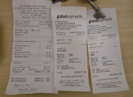 When checking the final receipt, the amount stated was correct, and the waitress told me to tap my card. But when we got home, I was looking at my card notifications and saw that 277.35 was charged instead. We then headed back to the restaurant and talked to the staff about this mistake. The manager apologised and voided the wrong amount, and we had to pay again for the correct amount.