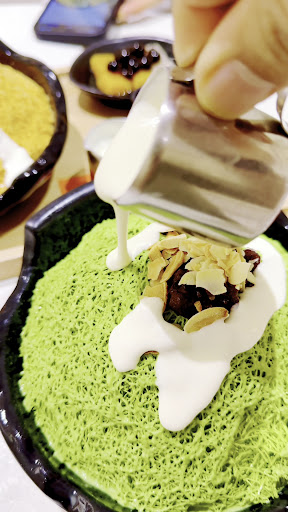 ✨✨Royal Matcha Latte Kakigori Visualize a snowy matcha mountain that melts with a velvety whisper. Each spoonful brings vegetal depth with creamy, grassy sweetness — the red beans add heart, while mochi and pearls bring chew and joy. It’s a serene moment in a bowl, and totally photogenic.