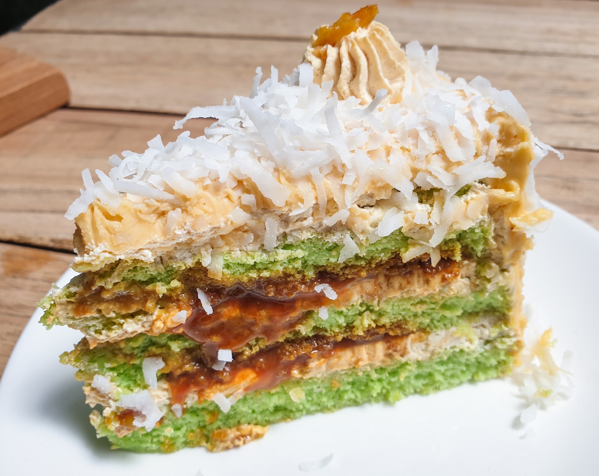 Oozing ondeh ondeh cake, so good. The layers of cake was moist and springy. Generous amounts of gula melaka trickled down the sides as we dug in, topped with fresh grated coconut. It had just the right amount of sweetness. Love.