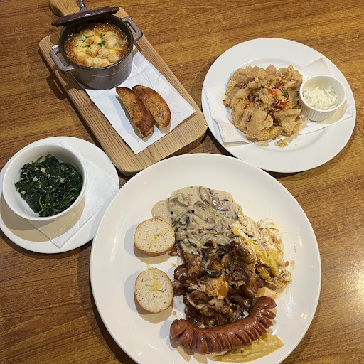 The calamari fritters were a deep fried masterpiece. The special aioli served was so addictive that I couldn’t stop dipping my fritters 🤤 And here comes the HIGHLIGHT: The awesome all day brunch!!! 🥓🍳 At first the portion didn’t seem much, but as you eat, you realise how filling it is and it’s really heavier than I thought 🤪 The roasted shaved pork was remarkable!! It was basically shredded porchetta - never seen this in a big brekkie so I’m very impressed 🤩 The German sausage was my favourite as it was chunky and firm, extremely juicy and of the finest quality (premium sausage I would say). The only type of sausage worthy enough to enter my mouth 😜 jk. Even the spinach deserves a review because it was so fresh and flavourful 😚🥬 I mean how do they even make vegetables delicious?? This place is just porkfection 🐽 Save this spot for your next visit if you’re craving casual French/Italian food or just a porky meal...