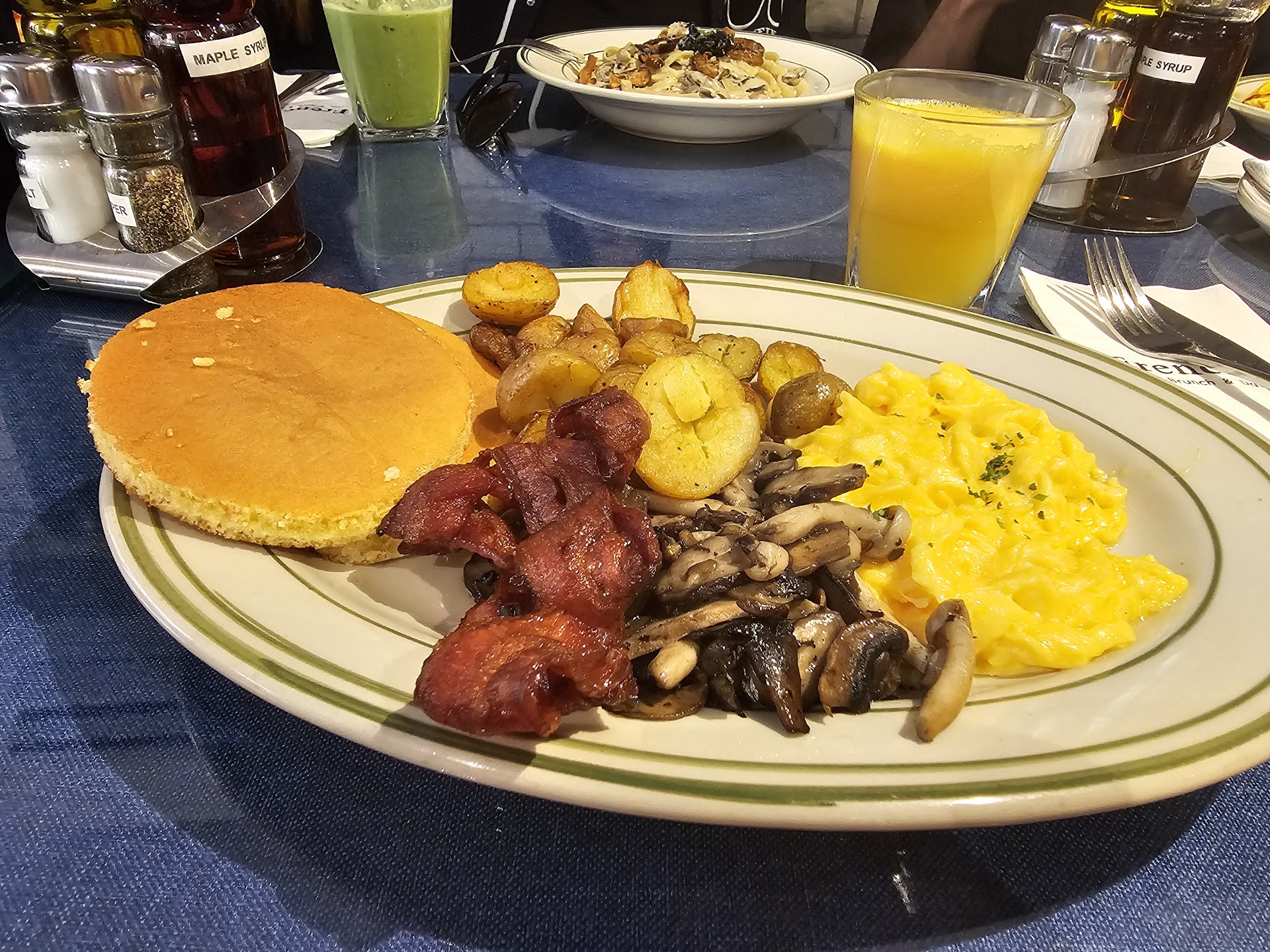 Service left a bit to be desired. We were placed at a corner table and they didnt turn on all the lights above our table until we were almost 2 hours into our brunch (thought the lighting was a bit dim but didnt think much about it until they turned on the lightsand suddenly we could take much better pictures of our food). The servers were also standing across from the room and it was hard to get their attention. We gave up and just walked to them to place additional orders. I ordered apple juice and they got me orange juice instead (to be fair, we were a large table so I understand getting orders wrong). The extra bowl i requested to share my mushroom soup was dirty.... and my friends truffle and chicken egg mayo was the LAST to arrive and it took almost an hour for his meal to arrive. So...