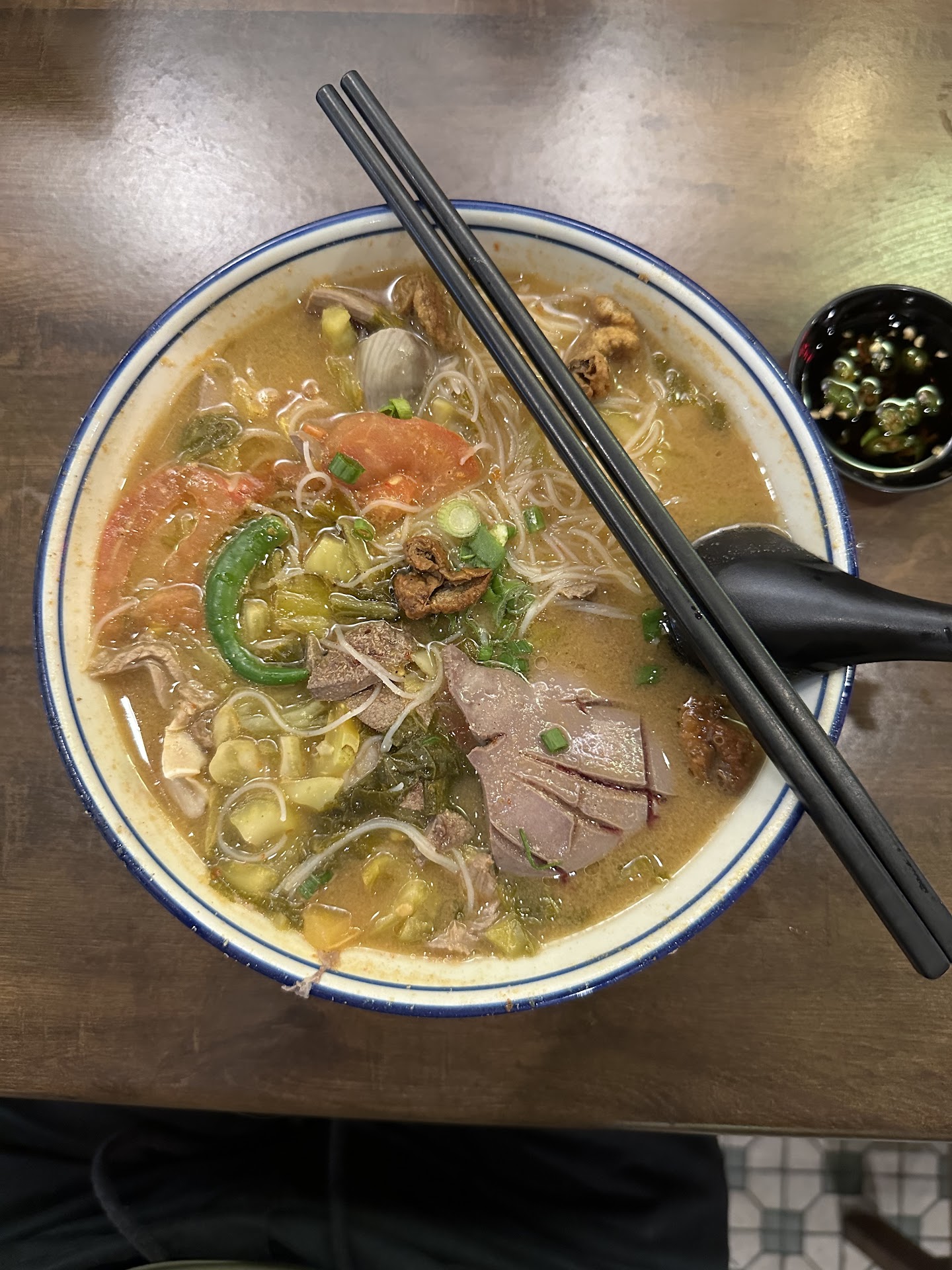 The fried fish noodle is ordered with the sour and spicy soup base and the dongguan meehoon. The Dongguan noodle is springy. The fish is ok.