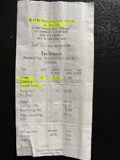 I don't mind the higher price of Young Tau Foo cost RM 1.50 per piece but a plain looking Chee Cheong Fun cost RM 5.00 that is a bit absurd. Purely profiteering from the stall. Attached is the bill, photo of the take away food and I add in photo from a popular PJ SS 3 Young Tou Fu stall for price comparison.