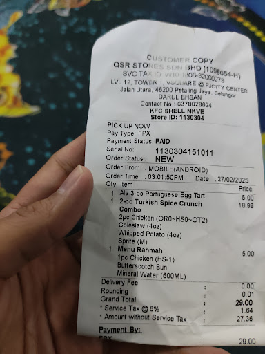 Read moreDropped by on the 4th of June at about 650pm. Ordered 2 sets of 3pc OR. Made specific request that I don't want breast meat & prefer drumsticks if possible. Yet I got 4pcs in total breast meat. I repeated 3 times "no breast meat" both in English & BM. The cashier said ok. Only realised this when I was home. I never have this issues with other KFC branches. Really...