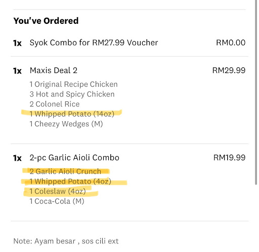 What am I going to do with so many coleslaw at home, if what I ordered was nuggets and cheesy fries? Imagine if you ordered several set consisting of chicken, nuggets, fries, wedges, whipped potato, and coleslaw, then when you arrived home, all you have are chicken, wedges, whipped potatos and extra coleslaws.