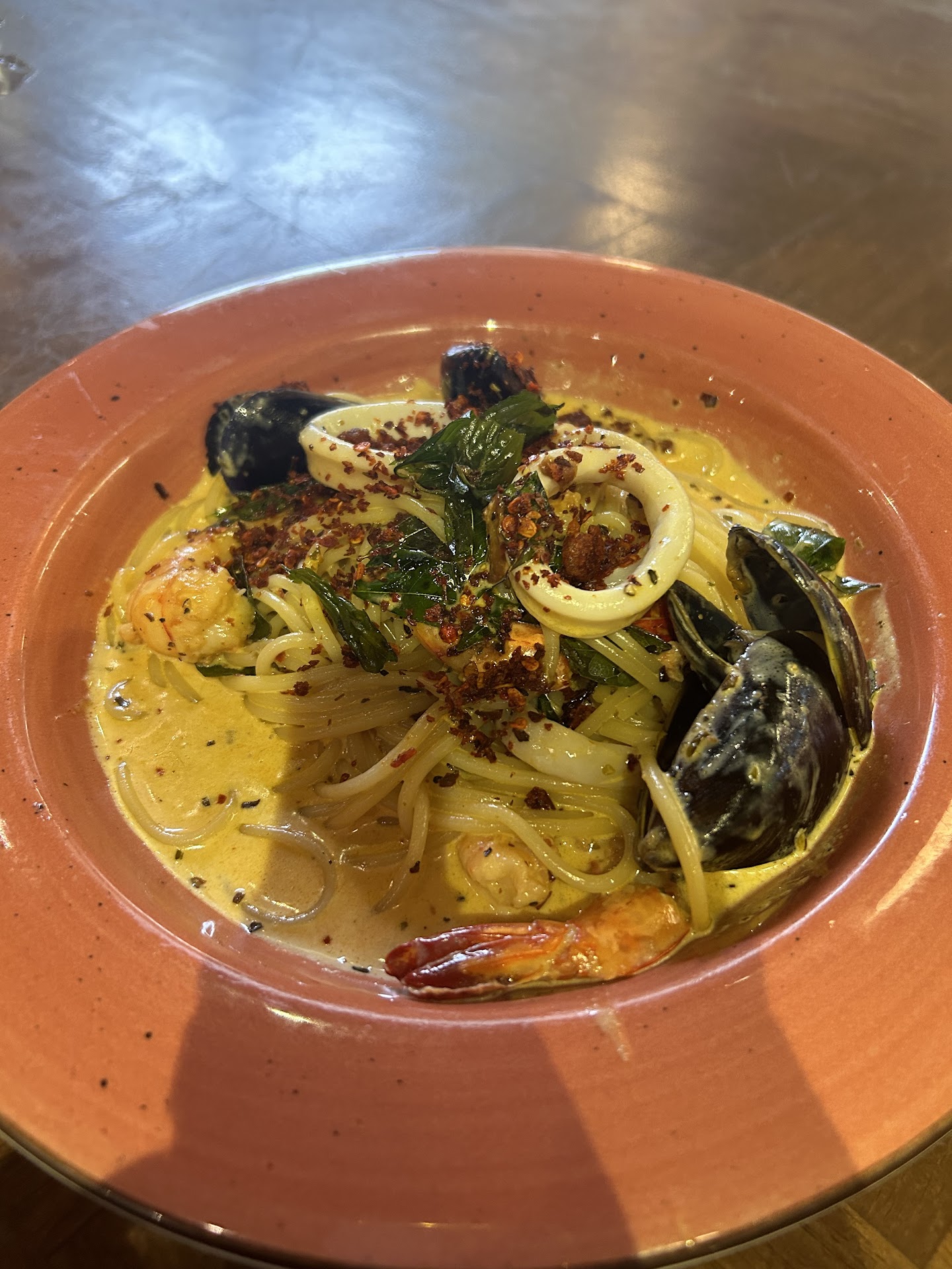 Since I prefer mild flavours, Ain patiently helped me choose a dish. She recommended the creamy curry seafood pasta, currently on a tempting 50% discount! To my surprise, the pasta was delicious! Rich and creamy with a delightful curry aroma + generous portion of seafood – three prawns, four mussels, and four squid rings. The finishing touch of chili flakes, fried curry leaves and dried shrimp added a delightful depth of flavour.
