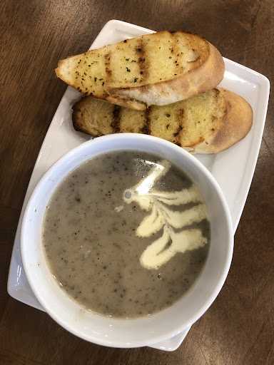 The mushroom soup with garlic bread was served lukewarm. It was also served with less than half the bowl filled. The soup itself was lumpy and tasted flat. The garlic bread was bland and tasteless.