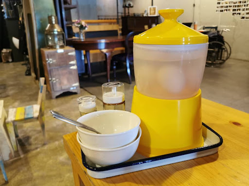 Inside is where the cafe comes to life - the tables and chairs are not uniformed; you could find retro stuffs such as old paino, barber chair, old music player, even bed frame turned tatami-style area, wooden cabinets, table made of sewing machine, even a boat turned into display cabinets. Even the counter has the used & repurposed railway sleepers.