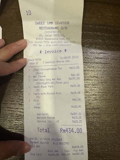Today I returned after 1 week with one extra guest. Served by a different lady, this time she recommended that for 3 pax, we should order 3 small prawns as it’s much smaller and will be good for each person. So in my mind, great. 1 large for 2 pax, but 3 small for 3 pax. Expecting the bill to be around RM200 perhaps. But guess what, the sang har mee bill came up to RM292.50 for 3 pax! More than double of what I paid for for 2 pax! The three small prawns were not small at all and in fact it looked almost identical to the large prawn I had the week before. This RM292.50 sang har mee could easily feed 6 pax instead of three.