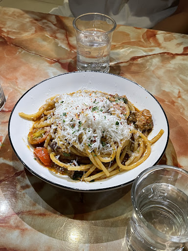 Andrew, a fellow pasta enthusiast, opted for the Tuscan Pork Jowl. His bucatini was cooked perfectly al dente, and the tender pork jowl with grated Grana Padano was simply divine.