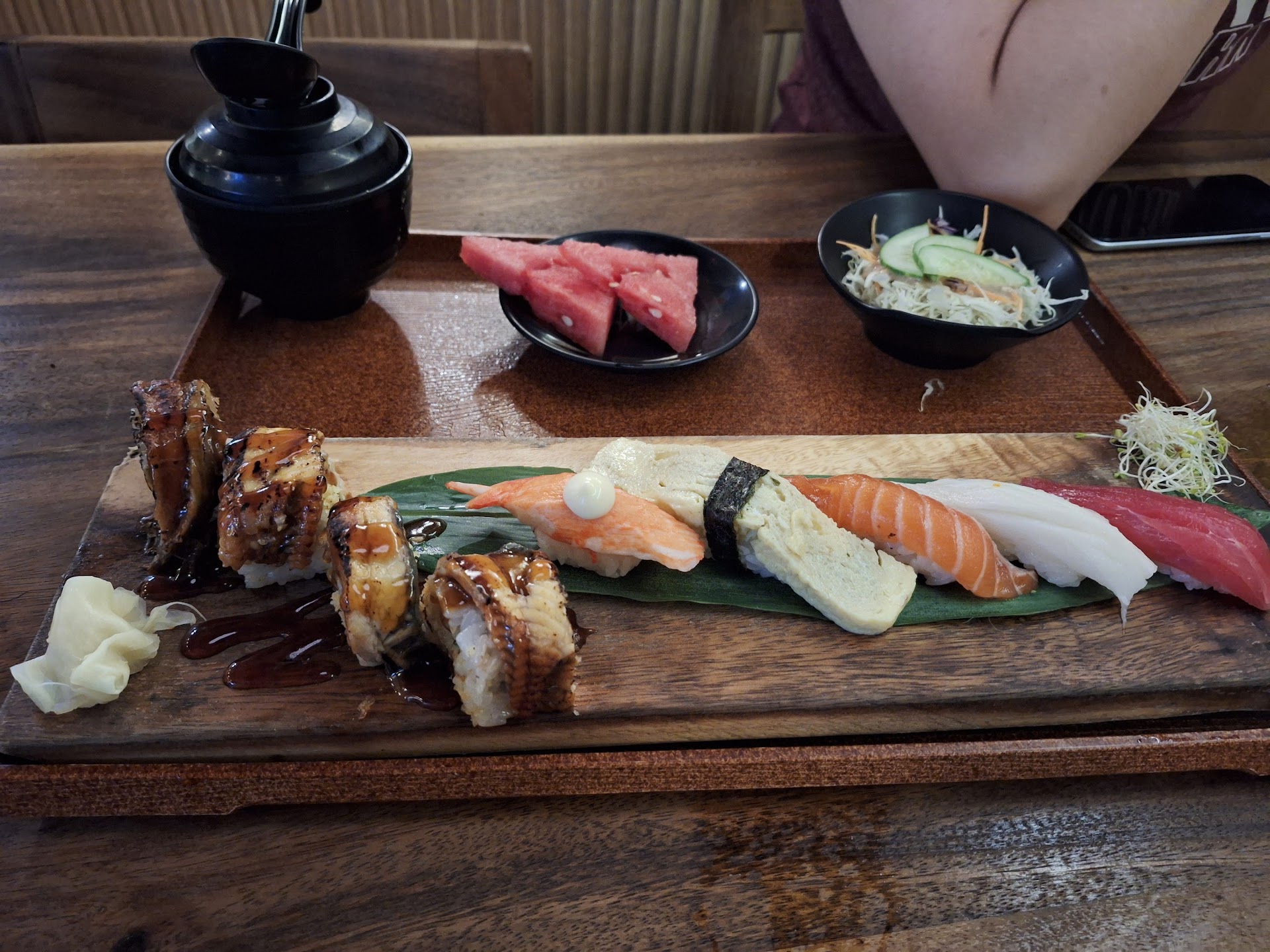 Ok first off, the food is great and prices are very reasonable. We ordered a sushi lunch set that came with a selection of sushi including 4pcs of unagi sushi, salad, miso soup and green tea. We also ordered 2 sushi rolls, a spider roll and a salmon roll. Each came with 4 pcs.