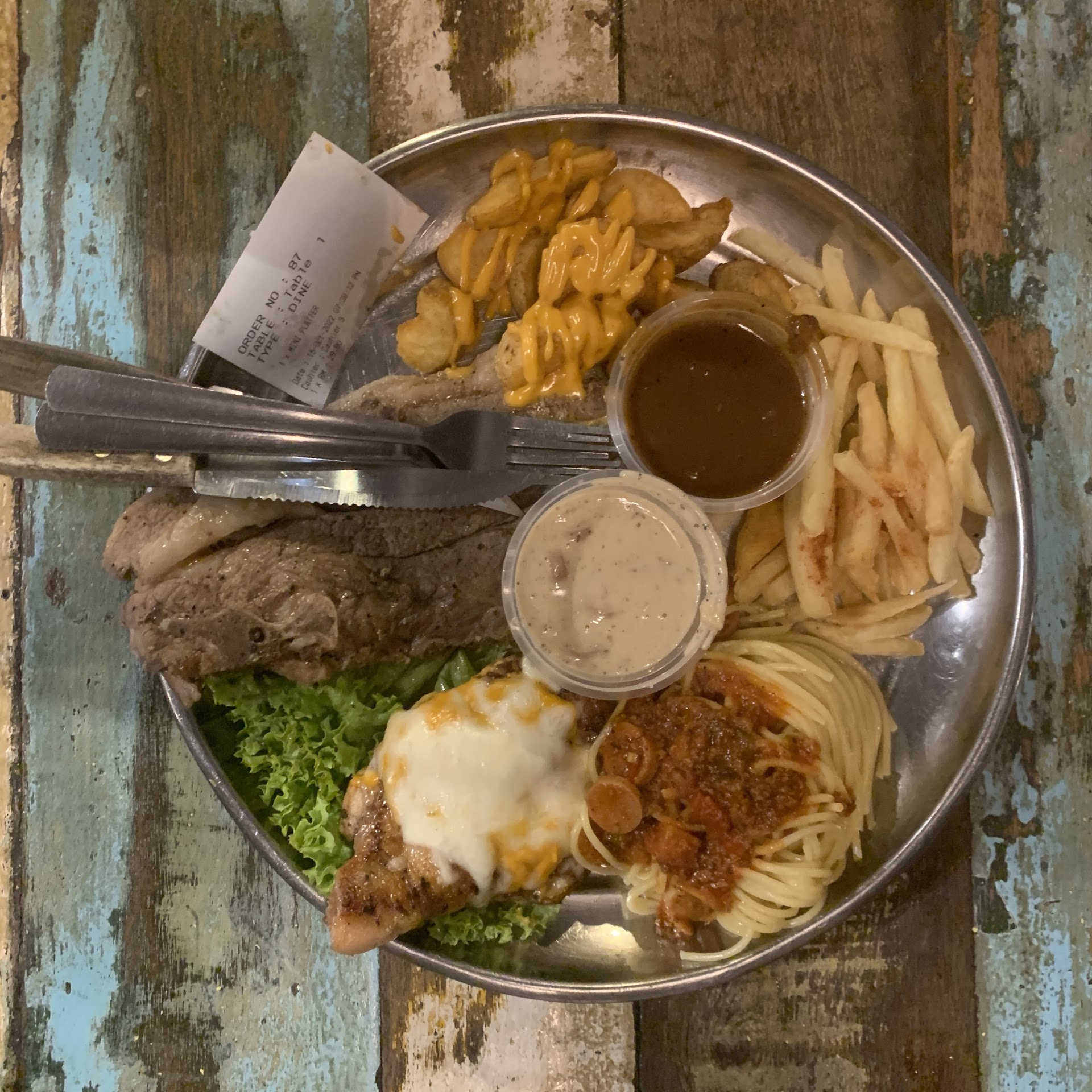 We ordered a big platter, suitable for 2-3 people and root beer floats. It only costs me less then Rm50 in total (which is super cheap). The big platter is served on a piece of big metal plate, and we have to use a cheap plastic plate as personal plates. It was very difficult to eat since the plastic plate is light enough and the grilled lamb is so tough to cut.