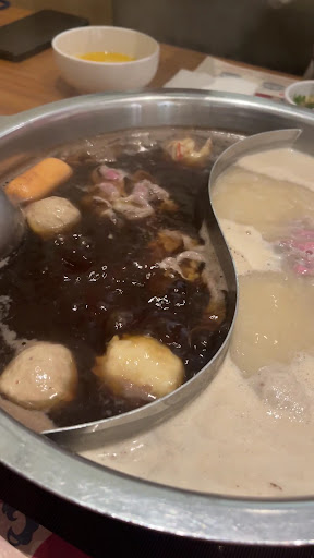 ◾take whatever you want from the buffet counter - greens, taufu, meatballs, sausages, mushrooms, corns, tomato, etc ◾They had clams and prawns too... Pretty fresh I'd say ◾Meat-wise you will have to order through the waitress who would bring out to you by tray. I ordered a lot of their thinly sliced pork belly that required minimal time in the boiling soup. I think that I might have ordered at least 6-8 trays of the meat alone. ◾the chilly sauce was passable.