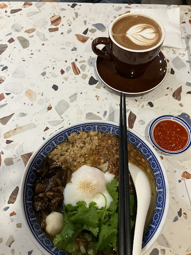 We went straight for the house signatures: sourdough noodle bowls, namely the mee jawa and the pan mee. They arrived brimming, positively overflowing with a carnival of toppings and condiments. The mee jawa’s broth was lush and velvety, thickened with sweet potato and deepened with squid sambal - rich yet balanced. Floating within were slices of fried tofu, hard-boiled egg, crisp vegetables and aromatic herbs, a flutter of fried shallots, and the crowning crunch of a prawn cracker. The pan mee, no less generous, carried shiitake mushrooms, minced chicken, golden anchovies, and a molten onsen egg that bled silkily into the broth.
