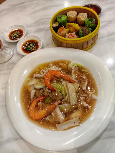 You will have a hard time to find parking lots near the restaurant. The dining area is divided by two sections with air condition and without (only fans). I ordered Prawn with Black Bean Sauce and Baby Kailan with Salted Fish. After ordering; the drink came after 2 min followed by Kailan, 8 min and Prawn 9 min respectively. The lunch crowd was not too crowded. Actually I had a purpose dining here because I want to compare the food serve here with 'HOMST', another chinese muslim restaurant competitor. It was my first time coming here. The prawn was medium size and I ordered the small portion (about five pieces). The black bean sauce was on a high side salty. As it was salty, it killed the taste. The baby kailan gravy was thinly watery and the vegetable was not so crispy. I was upset as the taste was not as delicious as I had expected comparing it to HOLMS restaurant. My expectations was disappointing. In comparison with 'HOMST', the taste...