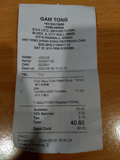 Bring my family to having lunch at here gam tong citymall . Saw one of the waiter by telling him we have 4 adults and 1 child and the waiter show us the table for 5. I am requesting a baby chair and waited for more then 5 minute not any waiter or waitress bring me baby chair at all. My child is 4 years old the ordinary chair is a bit lower to my son. Second finally the waiter came to us for ordering we order 2 watan ho , 1 Singapore fried rice noodle , 1 plate siu mai , 2 plate ha gao , 1 plate of roast pork wantan noodle , 2 Hk milky tea , 1 coffee Hk , 1 carrot juice. Waited for 25 minute roast pork wantan noodle , 1 plate siu mai , 2 plate ha gao , milky tea 2 and 1 Hk coffee finally arrive. Then the nightmare begin we been waiting our 2 plate of watan ho and 1 plate of Singapore fried rice noodle not arrive and we have waited for more then 40 minutes. Other diners late arrive and their food already served and we still waiting . We have 2 senior citizen being hungry waiting the food we order. I have politely asking the waiter when can they serve our food we already waiting for 40 minutes. The waiter not even apologize at all and giving us an excuse by saying their machine is in repair that’s why our order late serving. Even that our food not started cook yet. We asked the waiter how come no one come and notify us that the machine is out of order and need time to cook. If they have informing us we would not sitting there liked an idiot waiting and waiting. I am truly generous to give u 2 star at first I wanna give u 1 star or if I can choose no star I might give u no star at all… please train your waiter or waitress how to serve diner in a proper manner. Despite your food is delicious but if ur waiter manners bad it will spoil ur...