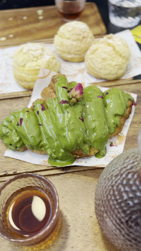 So we went for a coffee. Ordered cream puff and matcha croissant. Cream puff has perfect outer exterior and the cream was so good. But my favorite is matcha croissant. God, the croissant itself was very crumbly with layers and the matcha was very silky smooth with a floral scent on top. Since they put dried flower petals. The cold brew we ordered was good was not enough for me. I think it can only fill 2/3 grande size cup. Or even lesser.