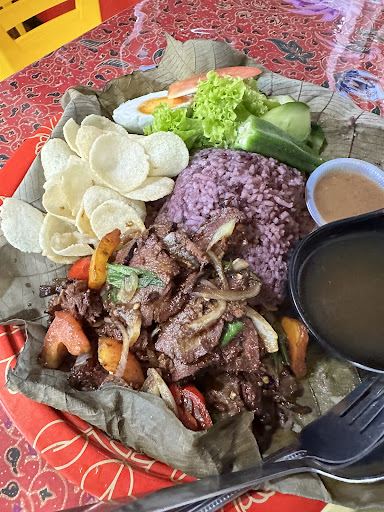 The meal was beautifully presented on a banana leaf, adding an authentic touch to the dining experience. The rice, a mix of white and black grains, was cooked to perfection—soft, yet with enough bite to make each mouthful satisfying. Accompanying the rice was a vibrant array of fresh vegetables, including crisp lettuce, cucumber slices, and a slice of juicy tomato, providing a refreshing contrast to the more robust flavors of the dish.