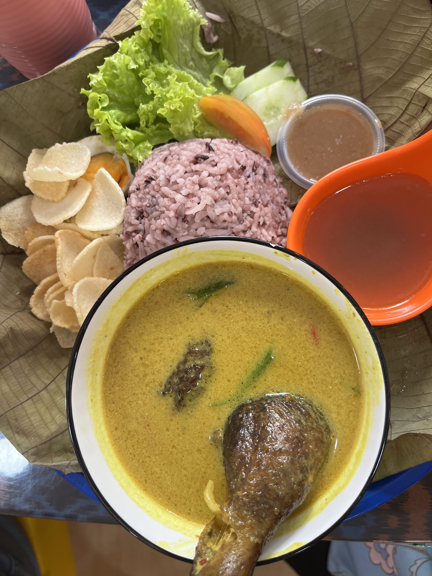 The meal also included a small portion of sambal, which was both sweet and tangy, enhancing the overall flavor profile. However, the soup served in the bright orange bowl, while flavorful, didn’t quite stand out against the more intense flavors of the curry and sambal.