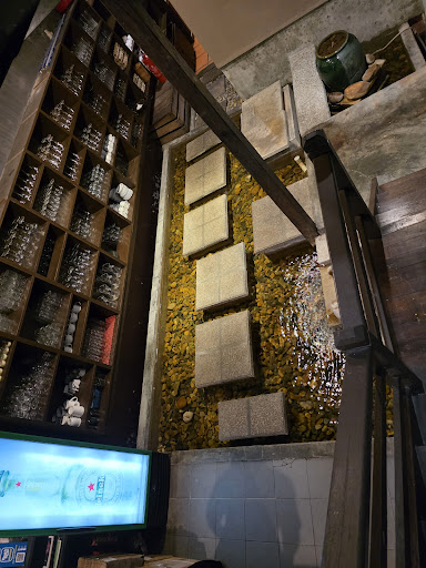 Access to the restaurant upstairs is via a number of paving slabs set over water, ahead of the stairs.